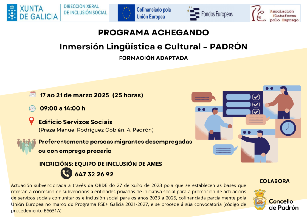 No marco do Programa “Achegando”, poñemos en marcha un curso de Inmersión Lingüística e Cultural, orientado principalmente ao colectivo de persoas migrantes. Esta formación ten como obxectivo principal promover a integración sociolaboral das persoas participantes na área de influencia do concello de Padrón.