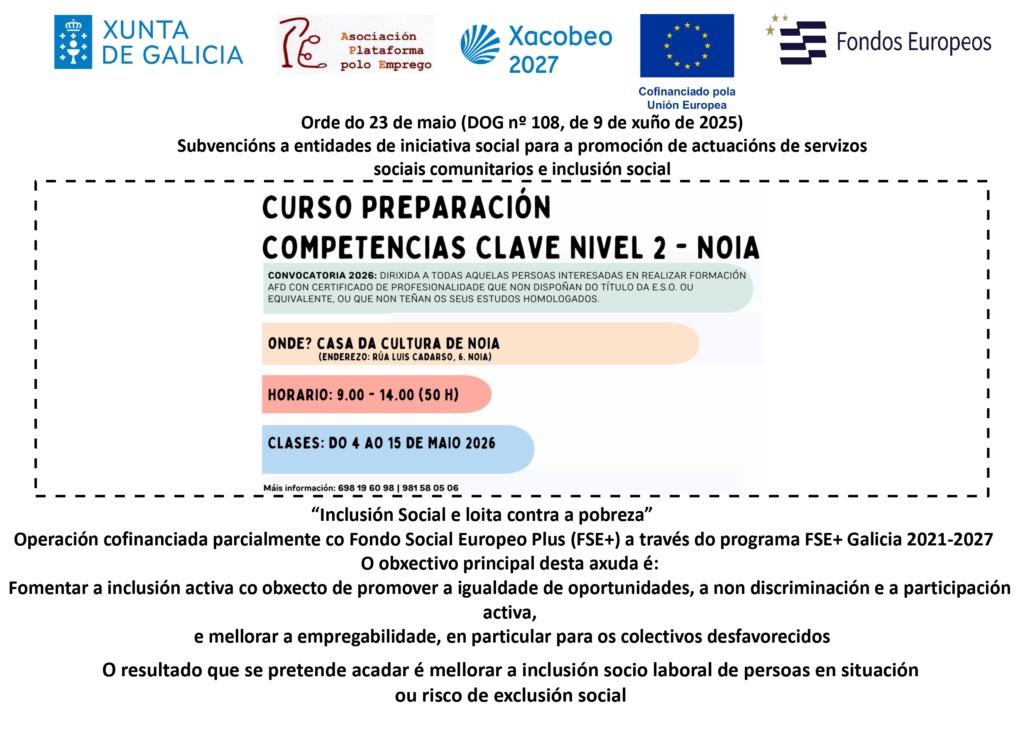 A Plataforma polo Emprego, no marco do programa “EMERXENDO_PRE_COMPETENCIAS CLAVE 2”, pon en marcha un curso de preparación das Competencias Clave de nivel 2 (Matemáticas, Lingua Galega e Lingua Castelá), en colaboración cos Equipos de Inclusión da Xunta de Galicia.