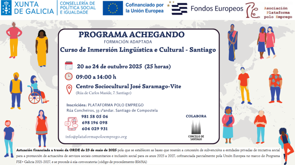No marco do Programa “Achegando”, poñemos en marcha un curso de Inmersión Lingüística e Cultural, orientado principalmente ao colectivo de persoas migrantes. Esta formación ten como obxectivo principal promover a integración sociolaboral das persoas participantes na área de influencia do concello de Santiago de Compostela